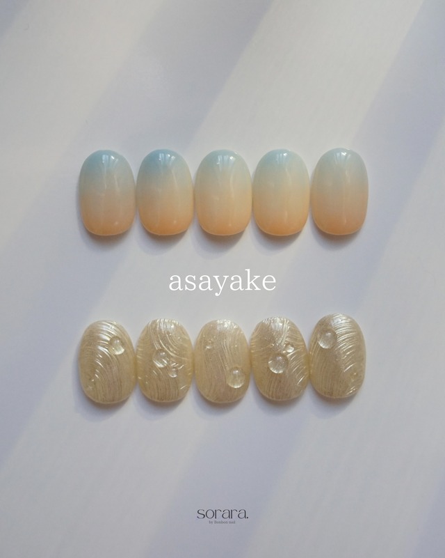 空と太陽 青とオレンジ 朝露と水面 素敵な1日を予感させる 朝日をイメージして デザインしました シンプルかつ繊細なグラデーションと 光に反射して輝く朝露をぷっくりと 表現しました | 商品内容 ▸ネイルチップ 10枚 ▸サイズ測定用チップ 1種類 10枚 ▸ネイルチップ取扱説明書 ▸prep kit ・油分除去・除菌シート 1枚 ・ネイルチップ用両面テープ 1回分 1枚 ・ウッドスティック 1本 ・ヤスリ 1枚 | ご購入の際の注意事項 ▾ご購入の際の注意事項 https://sorarabybn.theshop.jp/p/00002 ご購入前に必ずご一読をお願いいたします | オーダー方法 詳しいオーダー方法はhow to orderを ご覧ください ▾how to order https://sorarabybn.theshop.jp/p/00003 | サイズ測定方法 how to sizeをご覧ください ▾how to size https://sorarabybn.theshop.jp/p/00004